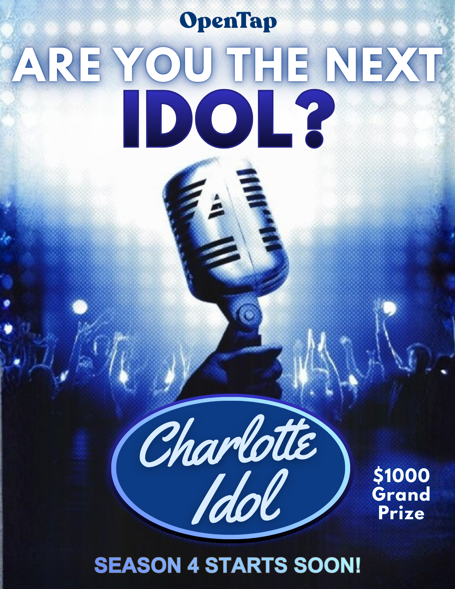 Charlotte Idol is a high-energy, live vocal showdown where 40+ singers step into the spotlight and compete for a chance to advance—with the audience casting the votes that decide who moves on and who goes home. Round by round, performances rise, all leading toward one ultimate goal: being crowned Charlotte Idol Champion and winning the $1,000 Grand Prize.